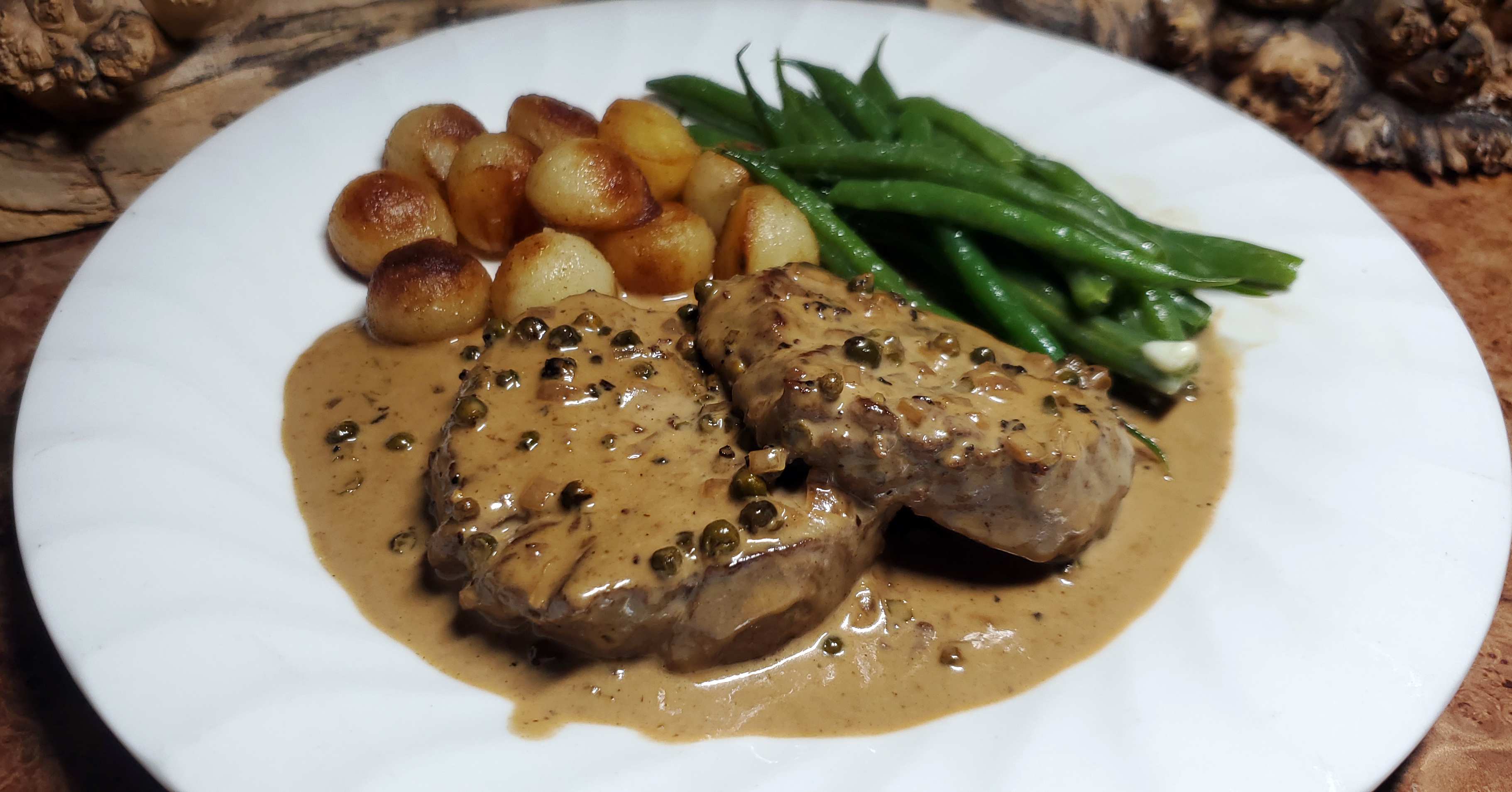 No real recipe – just salt the steaks, ( use either beef tenderloin or New York Strip steaks) and rub with fresh garlic, and, coat with lots of coarse black pepper.Soak a tablespoon or two of green peppercorns in hot chicken or beef broth (1/8 cup)NOTE: Soak peppercorns in wine or brandy instead of broth. Sometimes I use Armagnac.Heat a cast iron pan, until HOT, add a little olive oil and butter, and brown steaks on both sides. (We like our beef on the rare side so this doesn’t take long). Remove steaks, set aside, loosely tented with foil, and make the sauce. Saute finely chopped shallots and minced garlic until softened (about one minute) add the green peppercorns and broth. Simmer until almost evaporated and add a cup of heavy cream. Adjust seasoning, and simmer until sauce thickens.