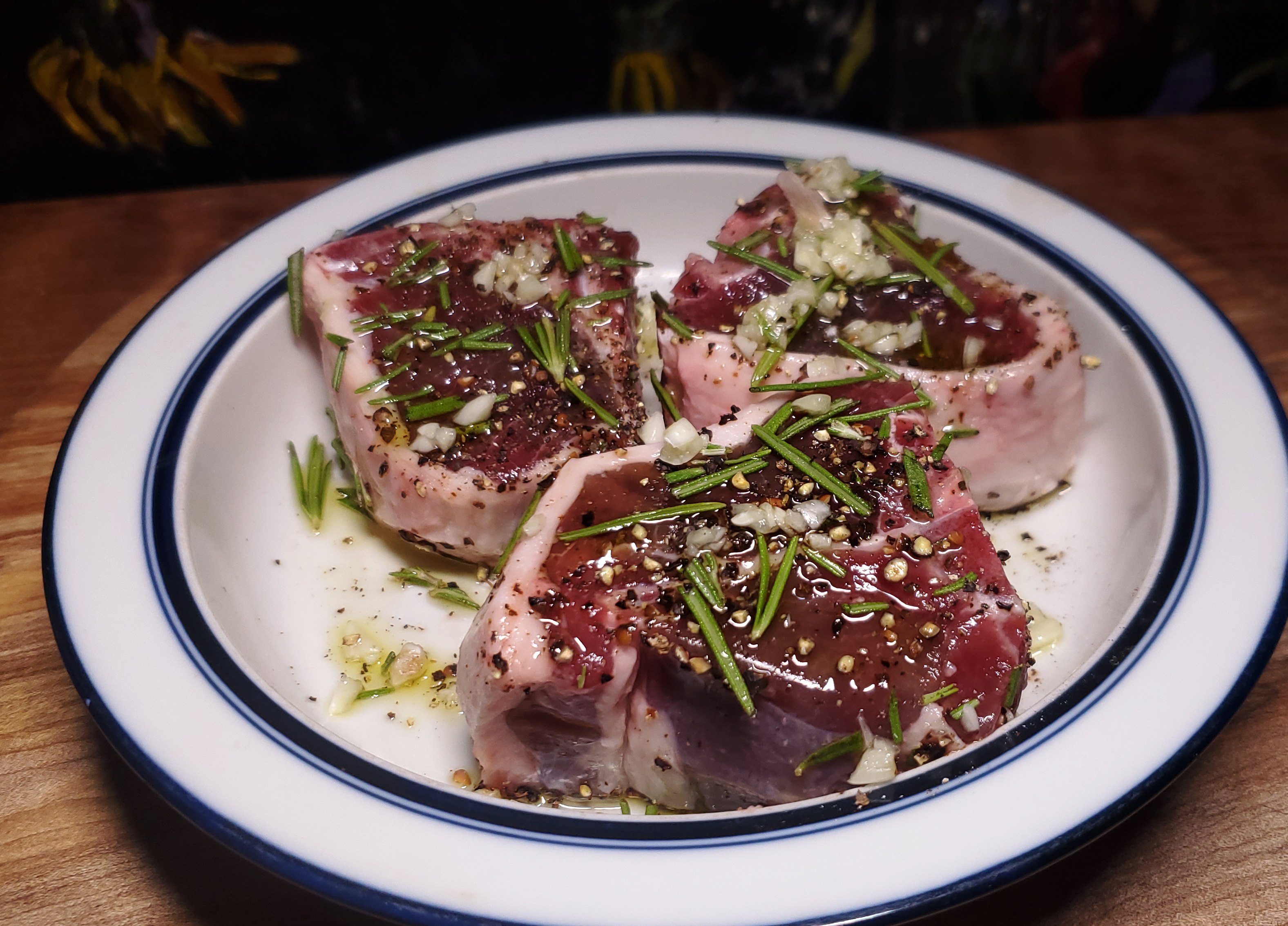 The next morning before leaving for work, I seasoned with fresh minced garlic, fresh rosemary, lots of black pepper and a drizzle of olive oil.