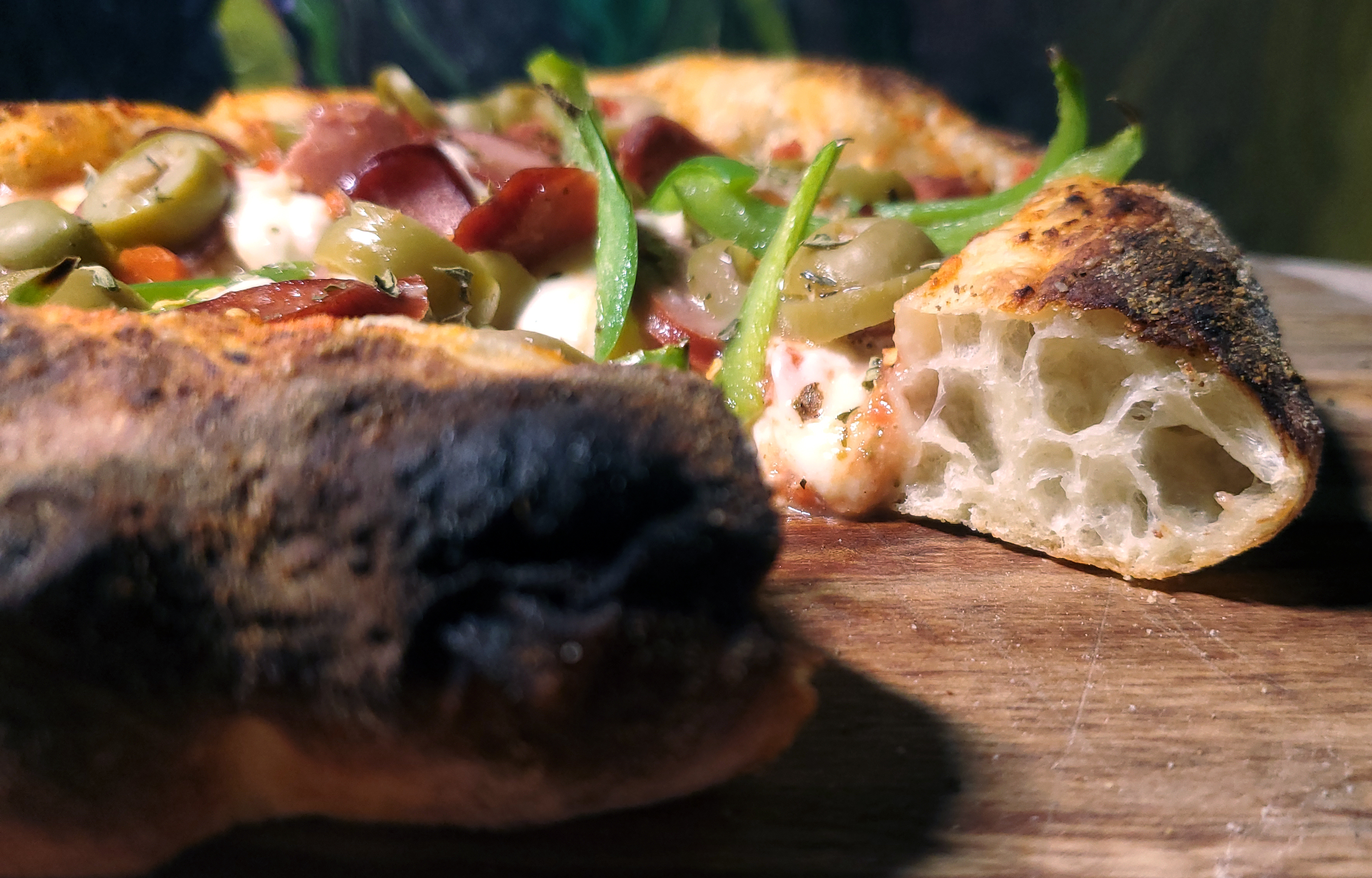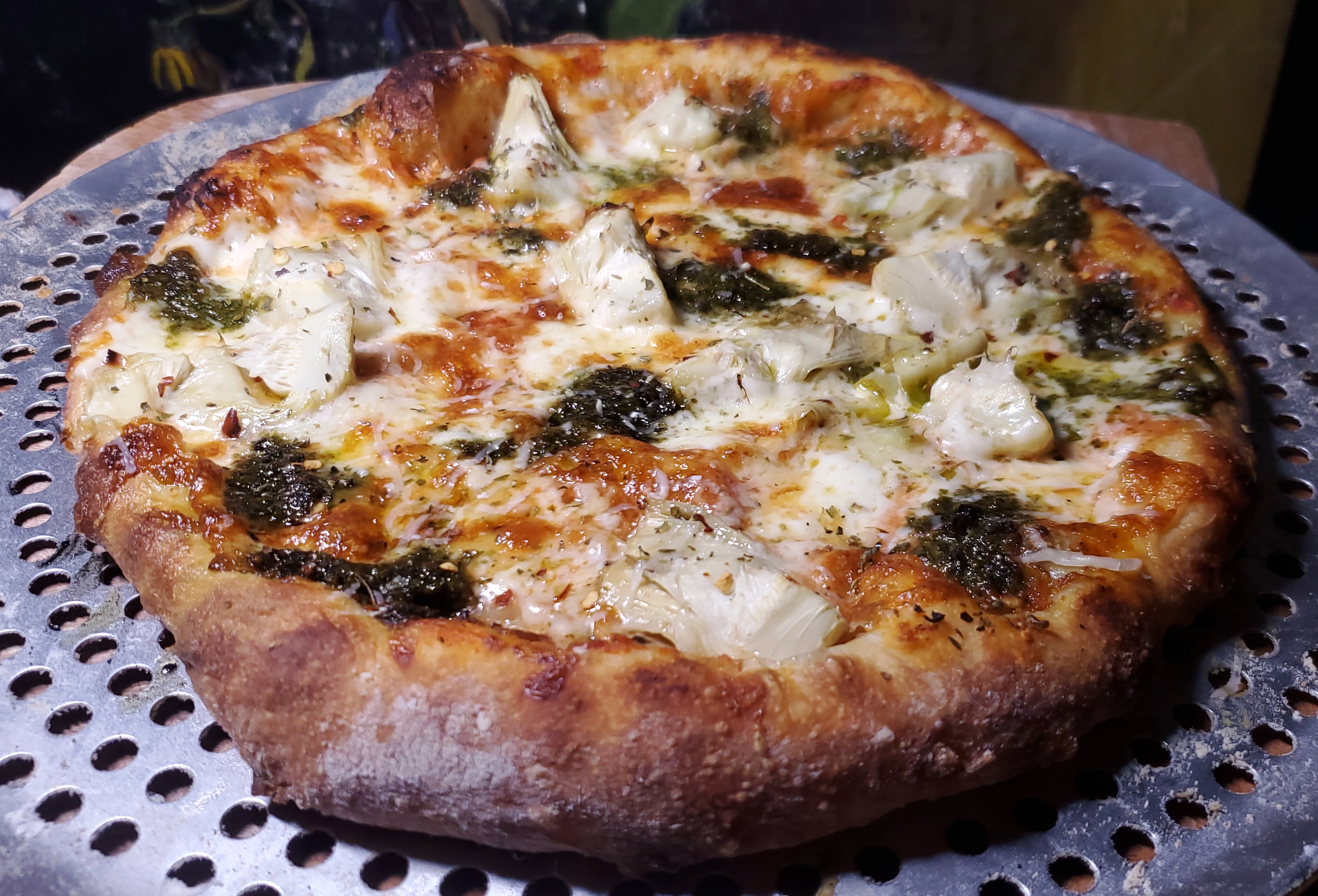 Matt used the larger ball to make an Artichoke and Pesto pizza, which he baked at 550°F on a stone in the conventional oven. The pesto was homemade. He harvest a number of our basil plants and made a batch.