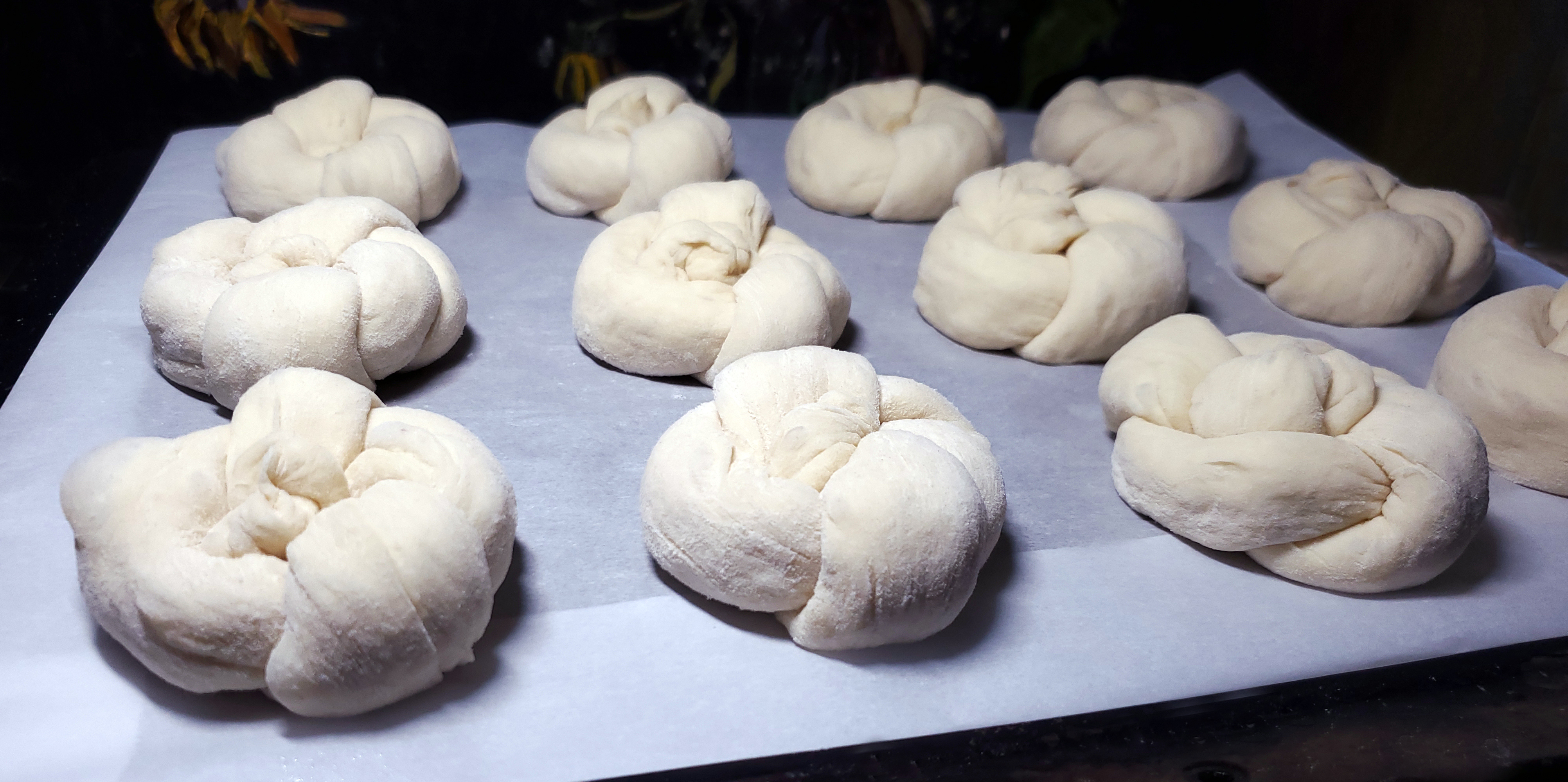 Roll each log into a rope about 8″ to 10″ long. Tie a loose knot in the middle and tuck one end down the middle and one end over and up the middle. Place on parchment, cover and let rise until doubled.