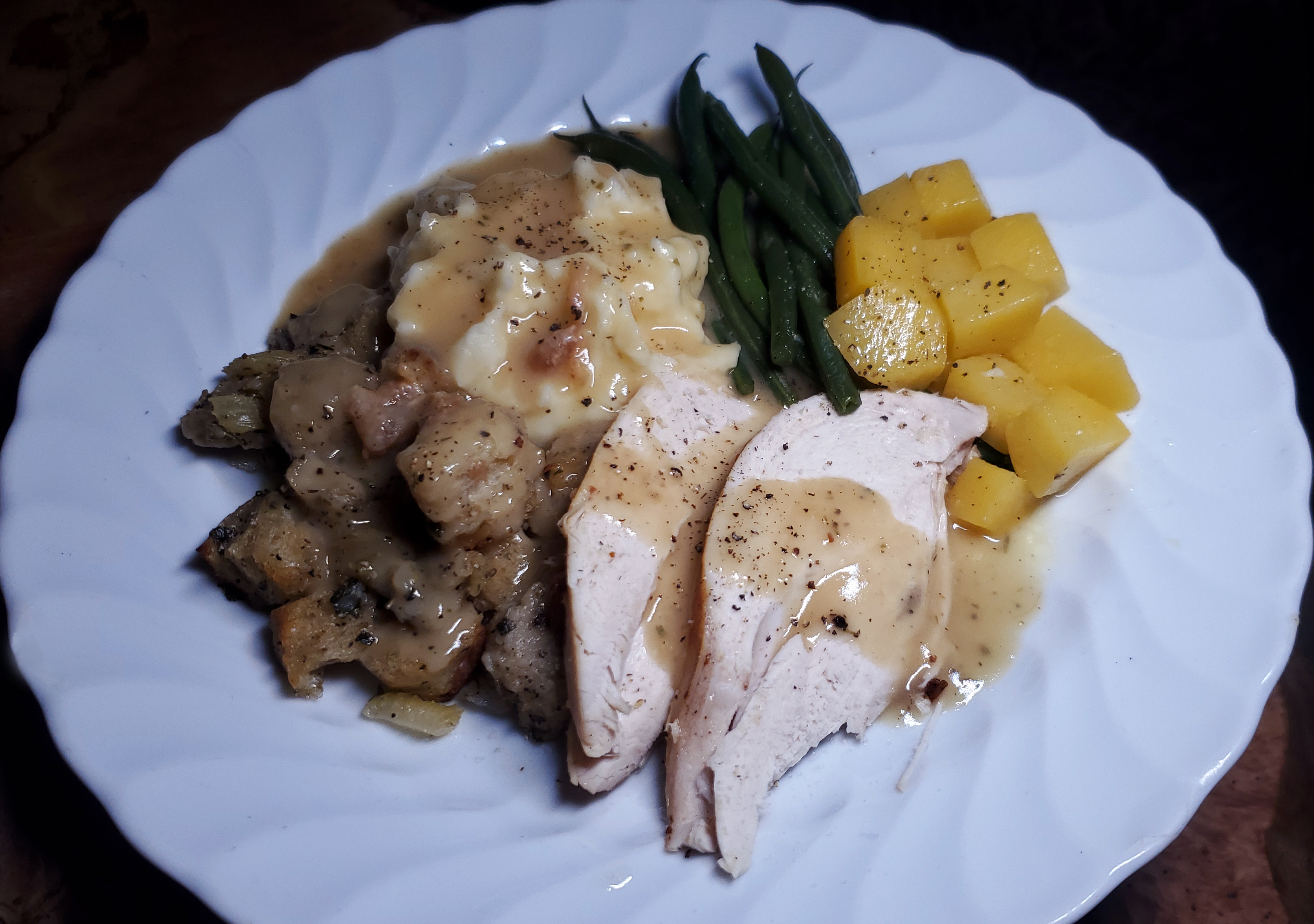 Sides were mashed potatoes, rutabaga and steamed green beans.