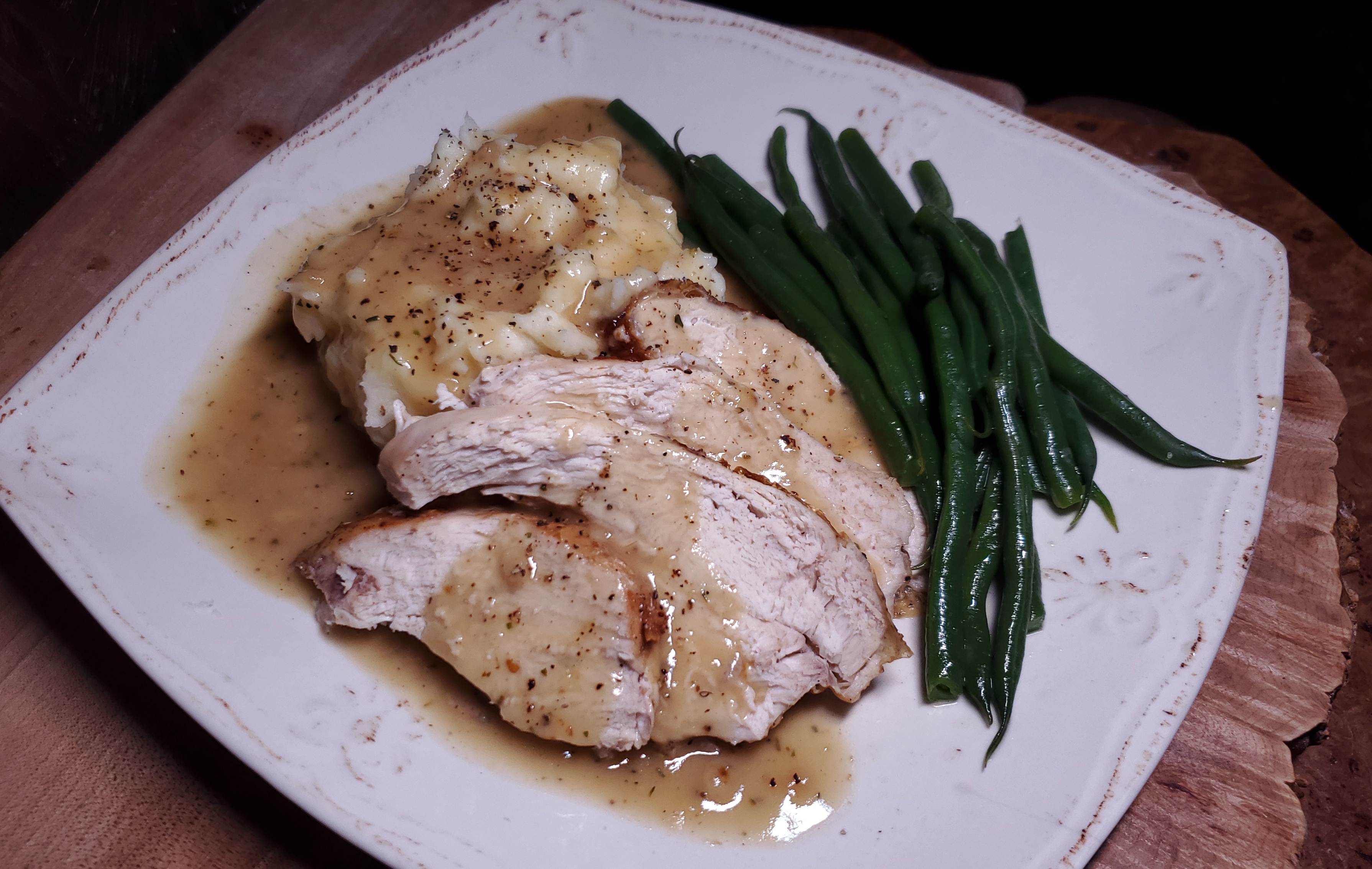 When the chicken came out of the oven, I left it to rest. Put the beans on to steam, made the gravy from the pan drippings and mashed the potatoes.