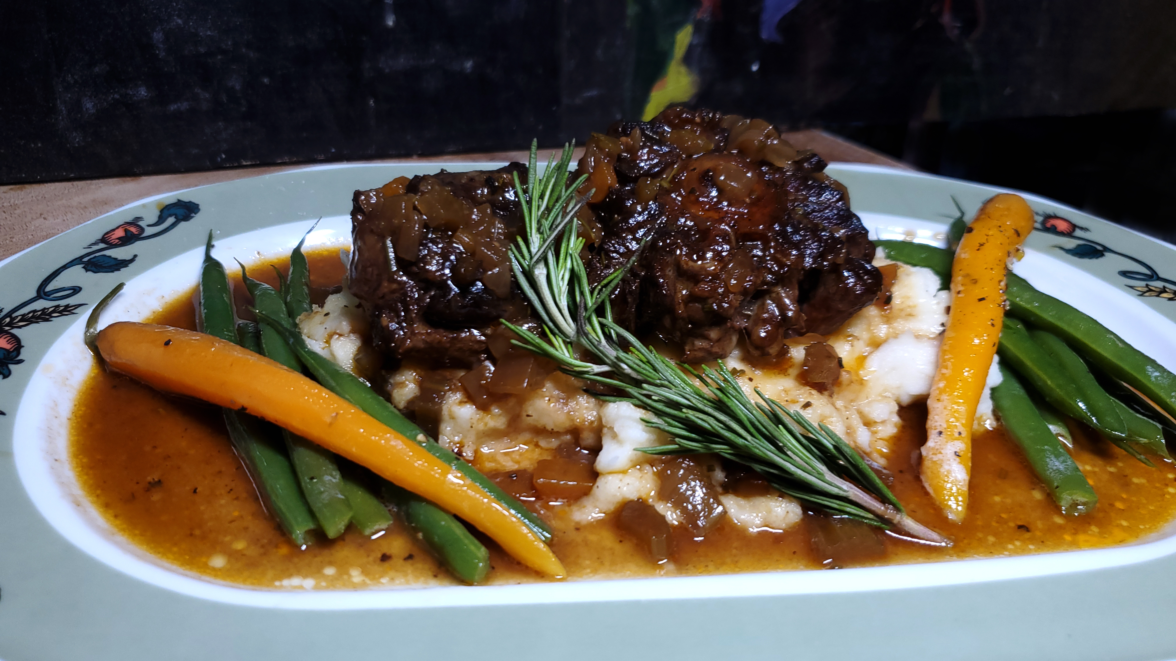 Oxtails. I often serve it over polenta or with spaetzle. And tonight over mashed potatoes. Thankfully Moe loves this dish too.