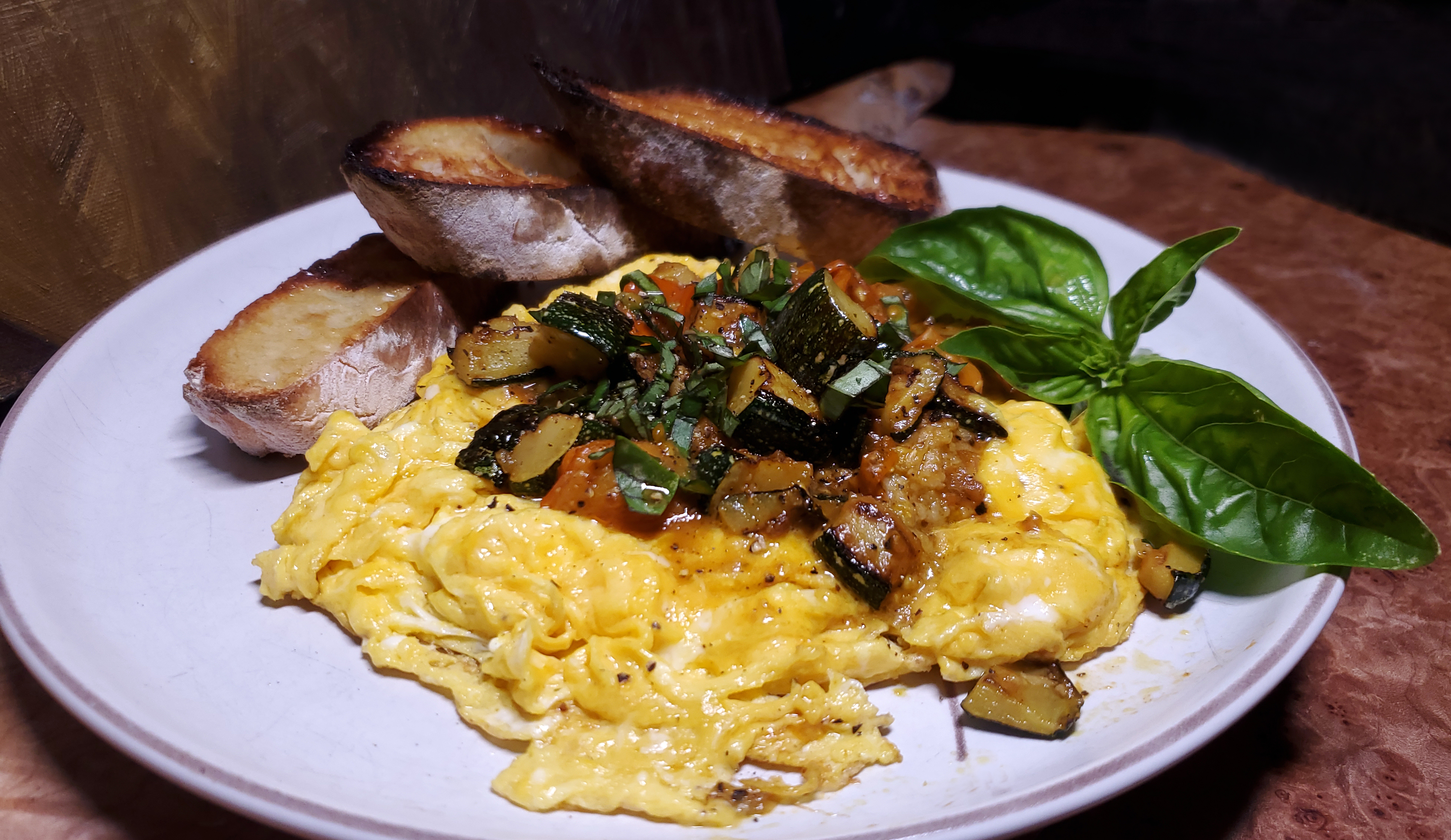 Open faced omelette with sautéed cherry tomatoes and zucchini, seasoned with garlic and basil.
