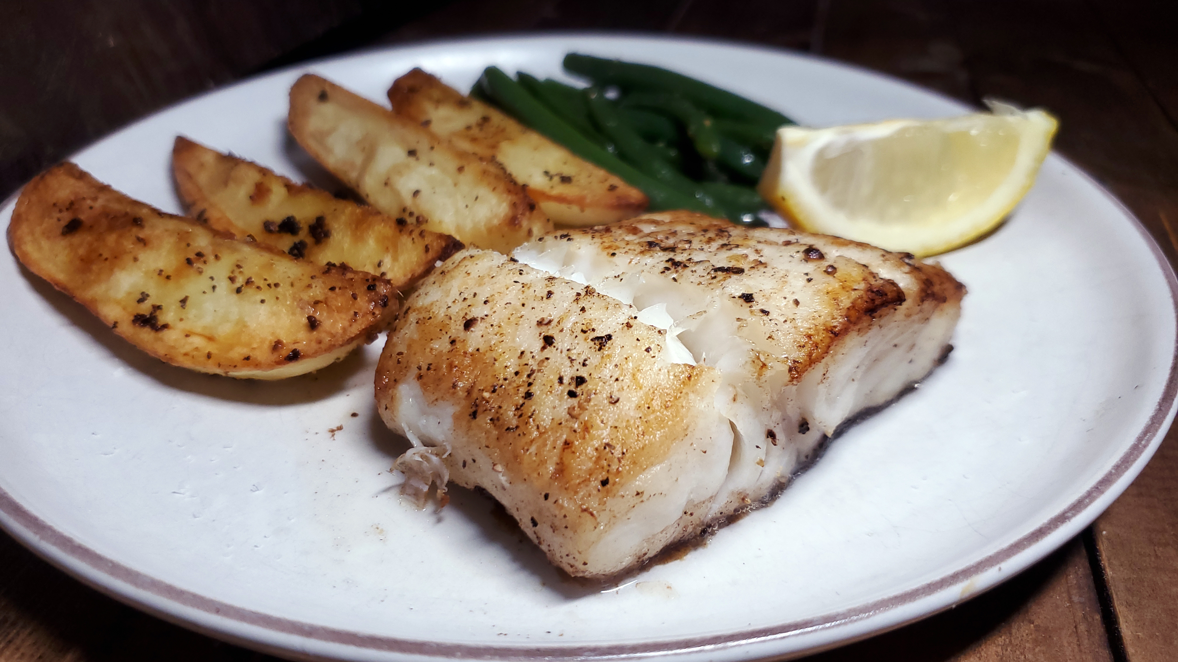 The halibut was seasoned with pepper and a tiny pinch of salt, and served with lemon.