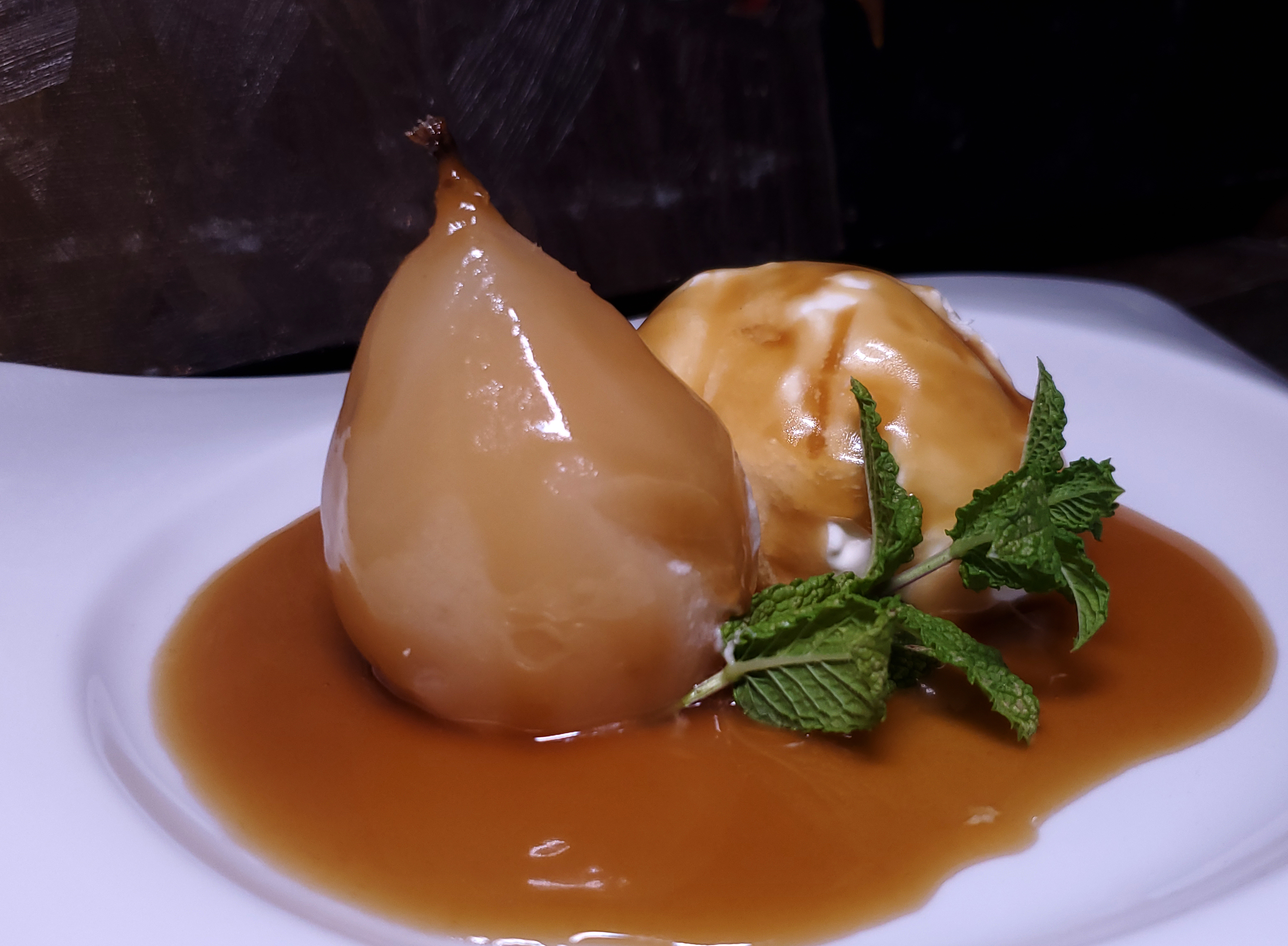 Poached Pears with Vanilla ice cream with a homemade caramel sauce.