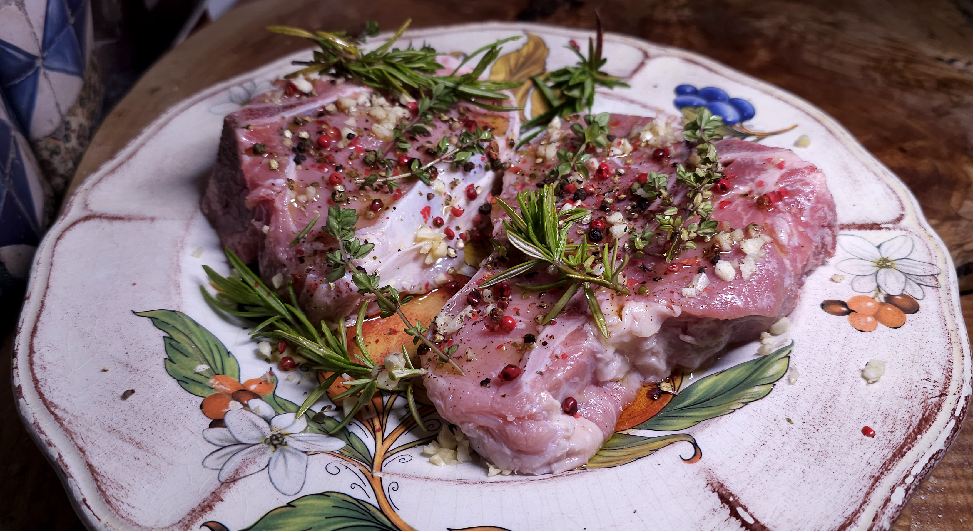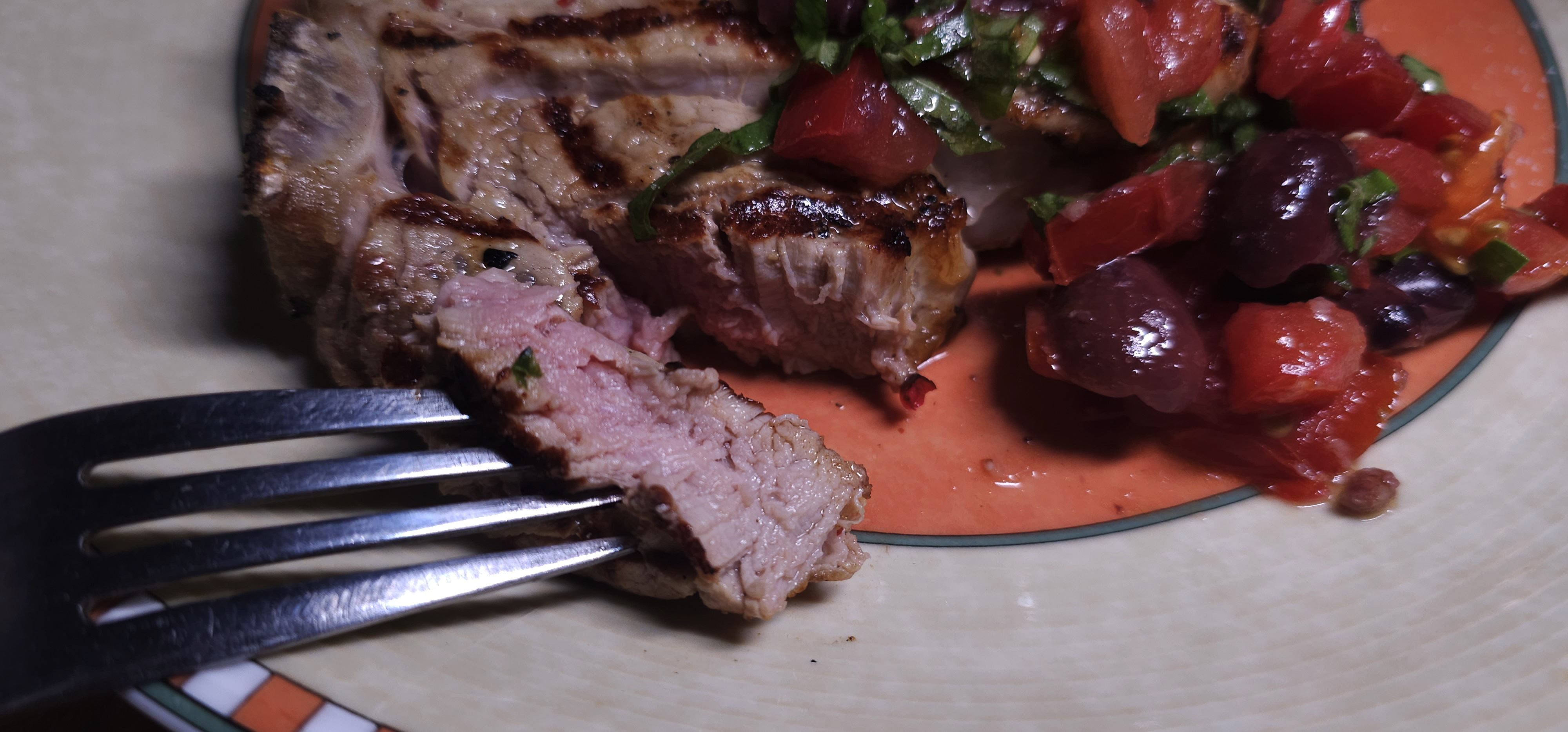 GRILLED VEAL LOIN CHOPS Posted by thibeaultstable on June 12, 2025 Getting a head start on dinner. Veal T-Bone/Porterhouse steaks ready for the grill. Garlic, Rosemary and mixed peppercorns. Bistecca alla Fiorentina style. Served rare with a Tomato and Kalamat olive, Garlic and Basil Salsa. Share this: Click to share on X (Opens in new window) X Click to share on Facebook (Opens in new window) Facebook Click to share on Pinterest (Opens in new window) Pinterest Like Loading... Related