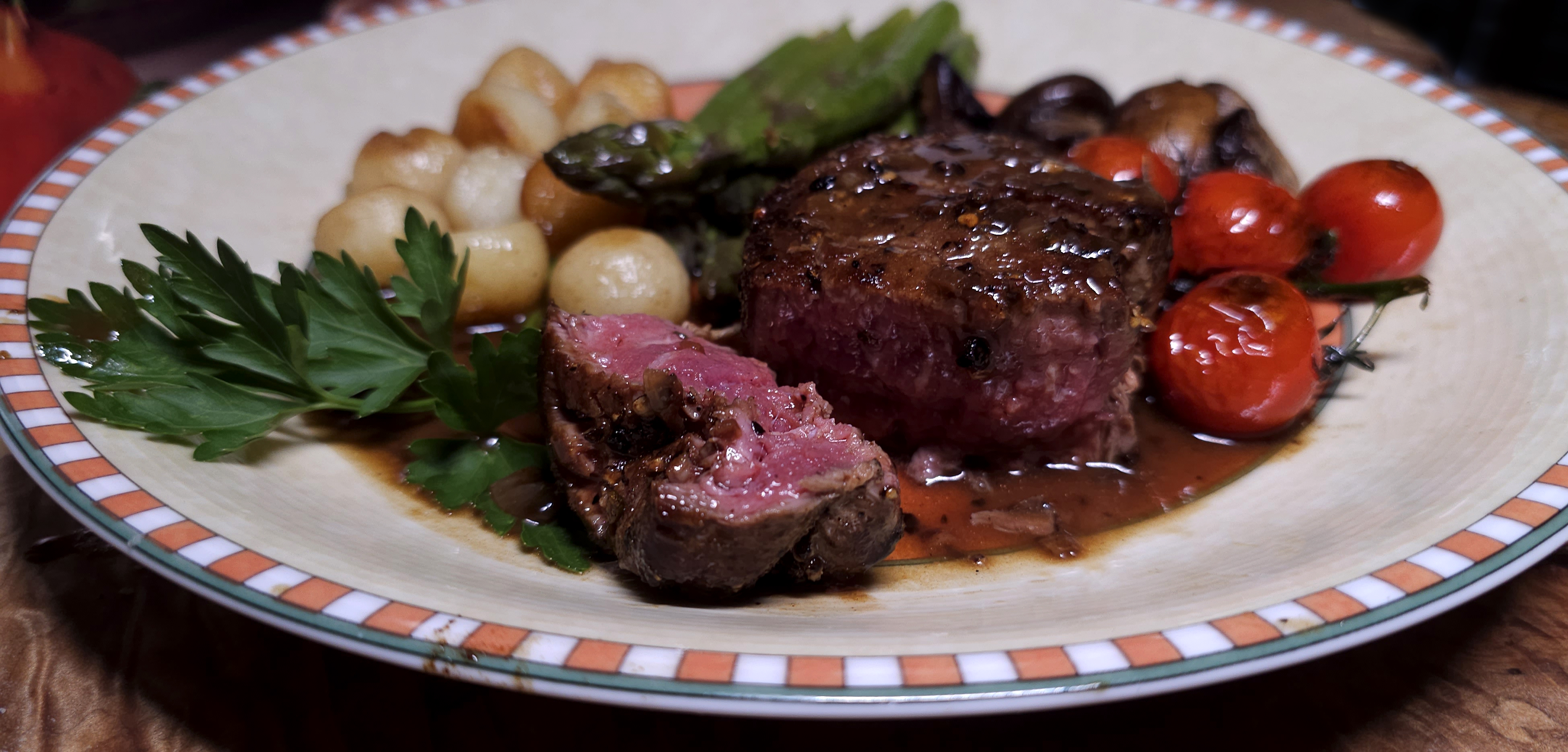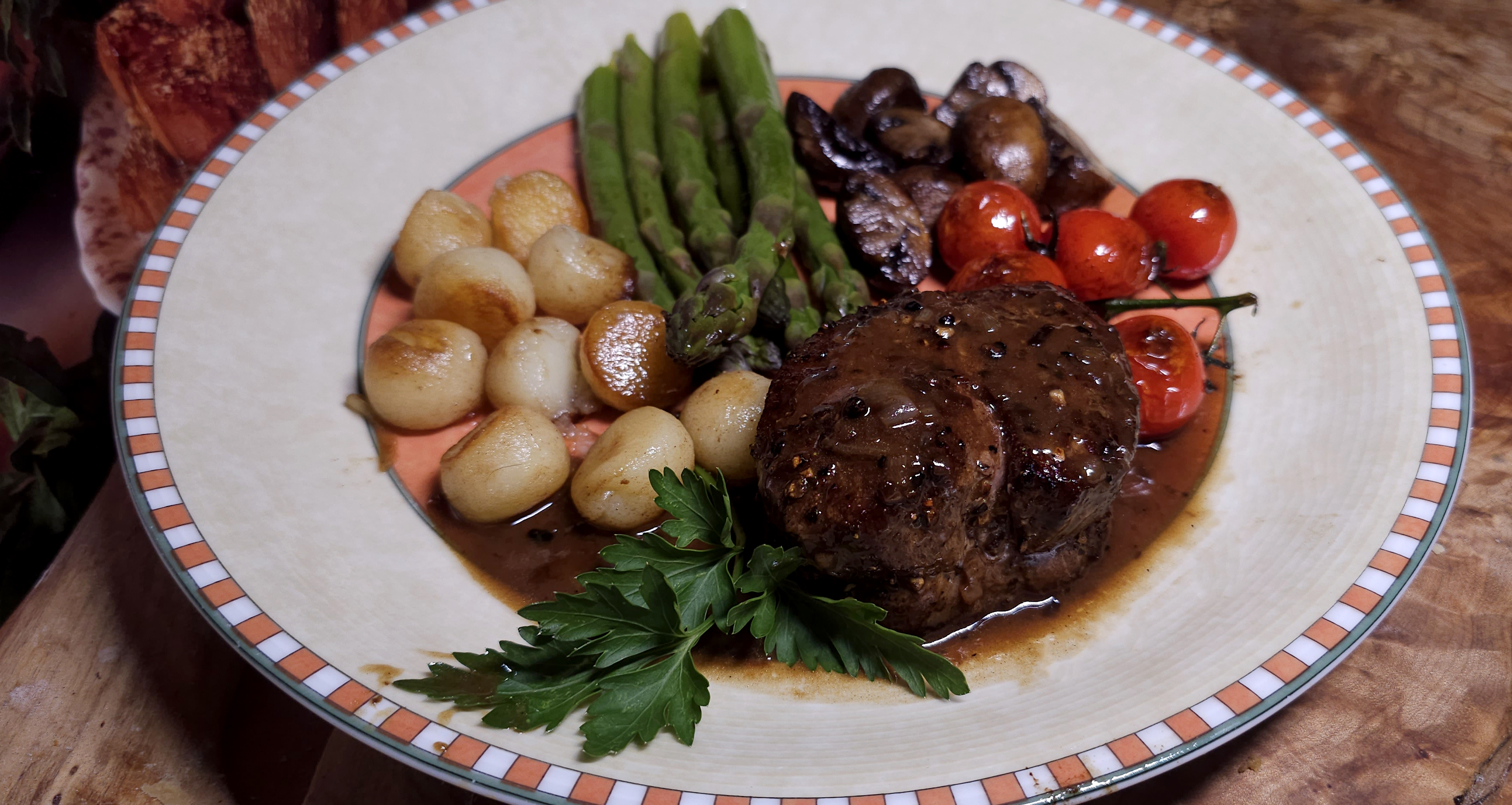Served with fresh local asparagus, Parisienne potatoes, mushrooms and sautéed cherry tomatoes.