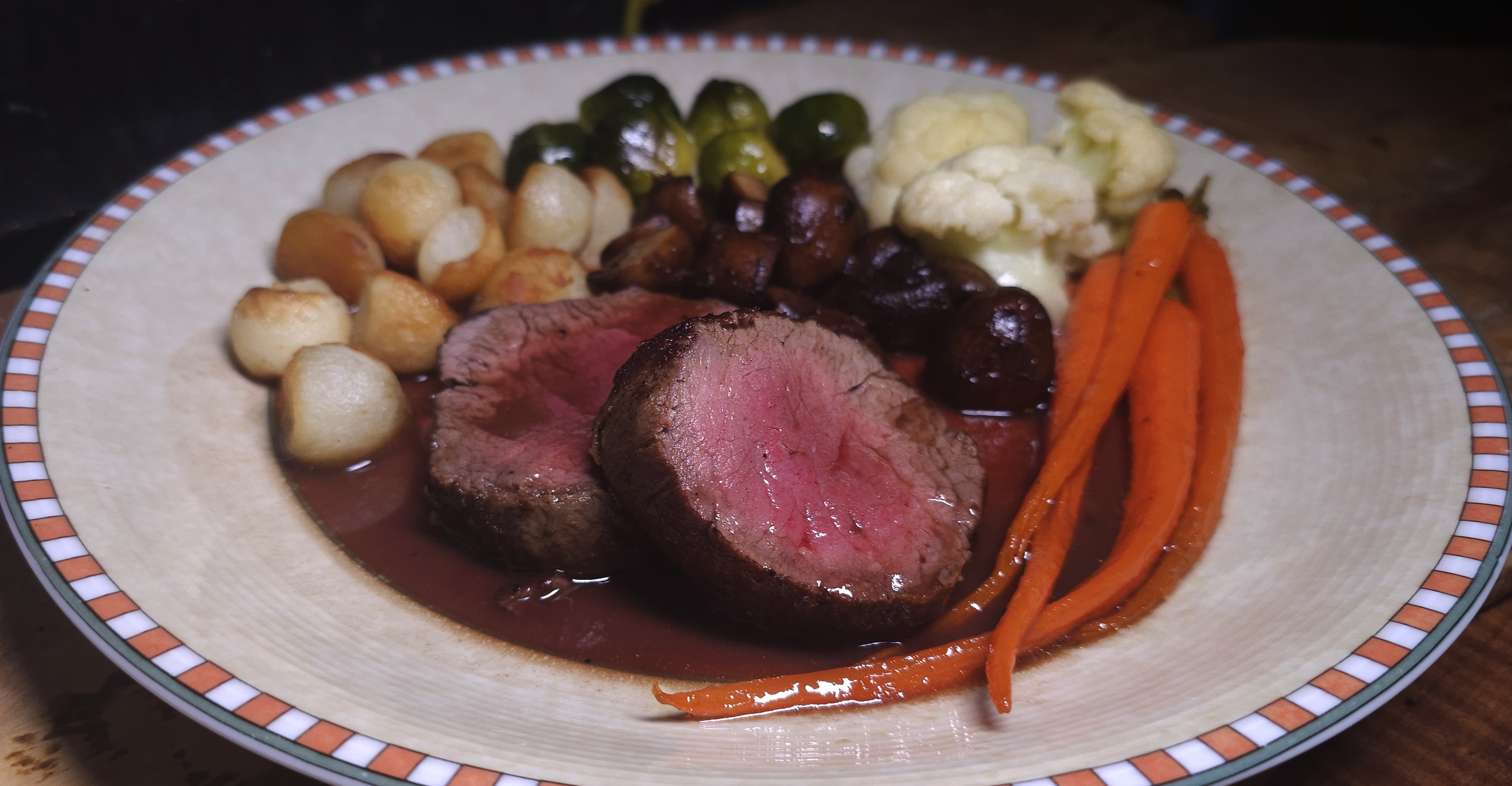 Sides were Parisienne potatoes, sauteed mushrooms, cauliflower and Brussels Spouts and glazed carrots for Moe.